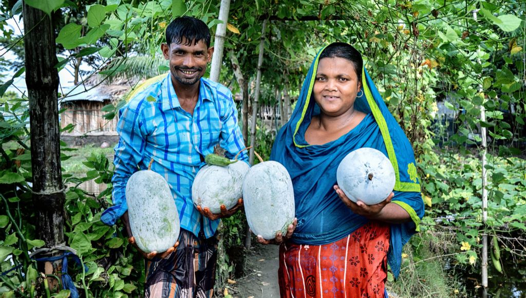 Sabuda Begum is working in her vegetable garden. Sabuda Begum and her husband MD Mosel Uddin Begh now work hard in their vegetable garden, fish farm to provide for their family. Now they are self-sufficient and getting nutritious food from their own vegetable garden. Satkhira, Bangladesh