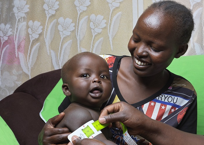 ACF staff Betty Cheyech gives MUAC to Agnes Lemukereng 9 month old baby Filex Poriot in Kasei, West Pokot county, Kenya.