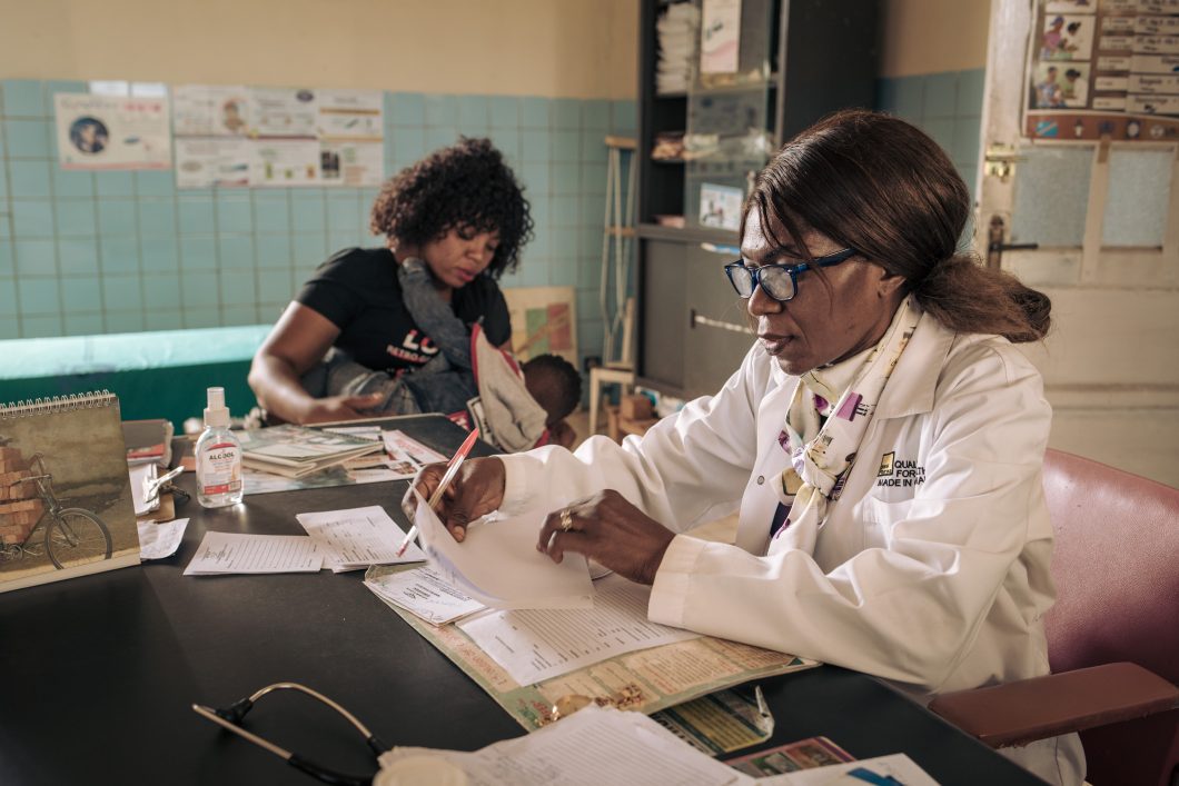 Prudence, head doctor of a paediatric healthcare centre in Mbuji-Mayi, sitting at her desk.
