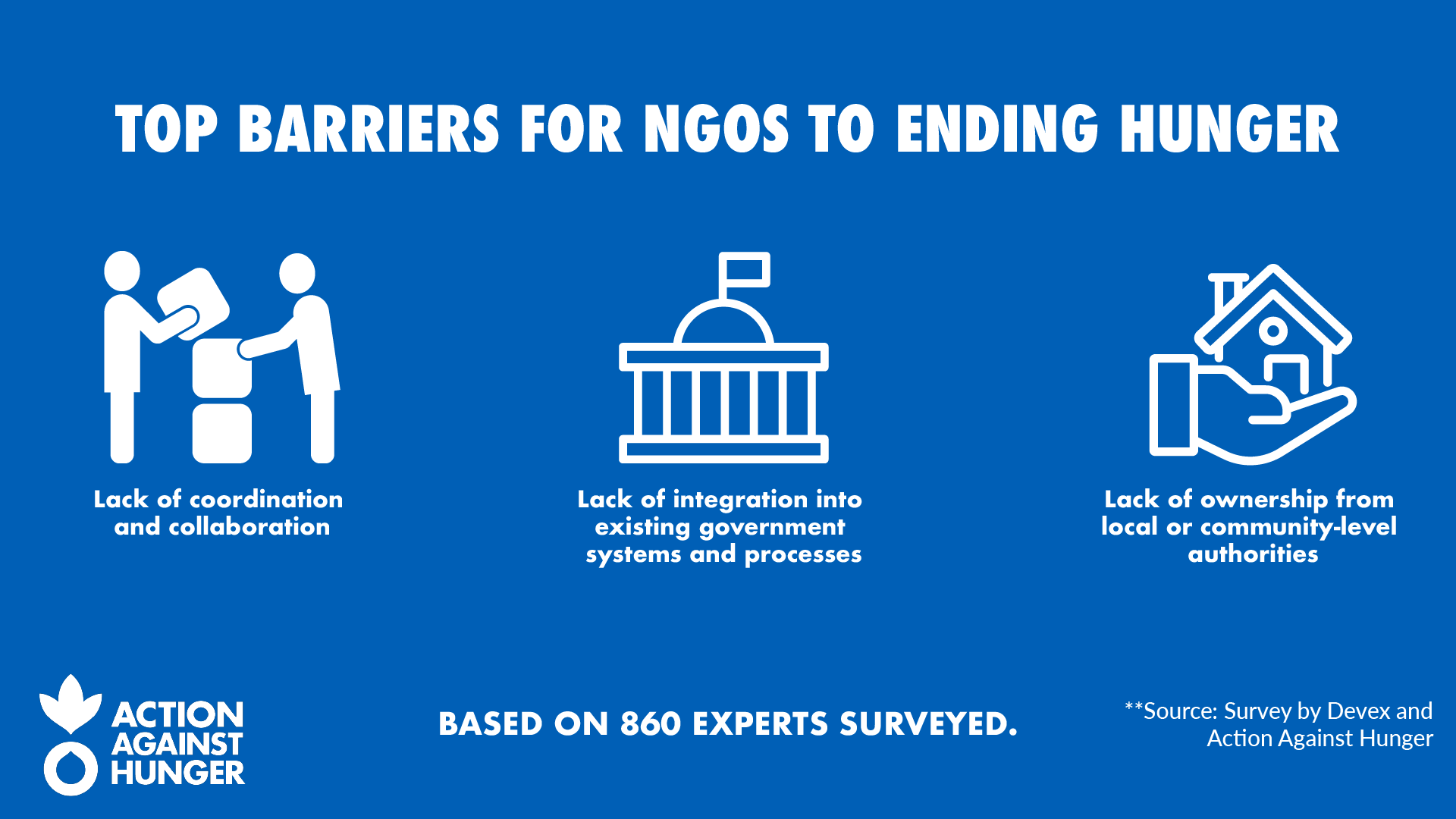 - Collaboration. Sixty-two percent of survey respondents said that a lack of clear, unified policies around hunger from national governments, donors, and other actors hampers true collaboration.