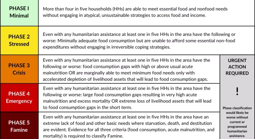 There are five IPC phases used to classify the severity of hunger and food insecurity. Each phase has its own technical criteria.