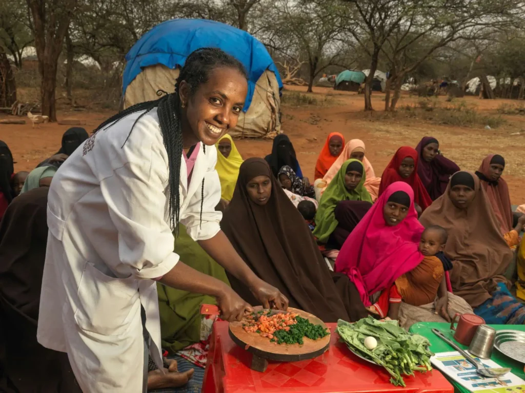 What makes her especially proud are her cooking demonstrations. Using only ingredients families can find locally, Gelaye shows mothers how to prepare meals with the nutrients children need to grow and thrive. She explains the value of each food, in the community’s own dialect, so the lessons are clear and easy to remember.